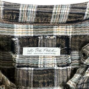 Free People Jessi Plaid Balloon Sleeve Top. Brown plaid print blouse with henley button placket. Puff sleeves.. Oversized fit. Slightly cropped.