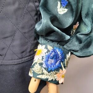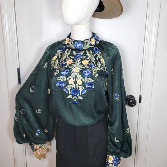Keywords: Boho chic embroidered blouse, Holiday blouse, Free People fall festival top, Green floral embroidered shirt, Johnny Was inspired embroidery, Statement sleeve embroidered blouse, cottagecore fall winter bouse