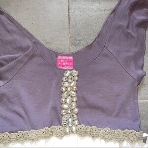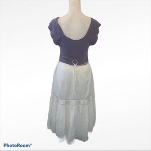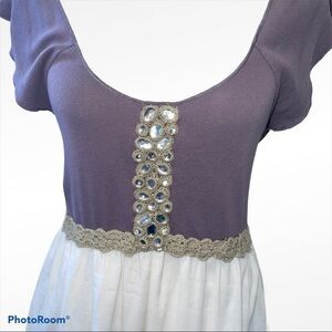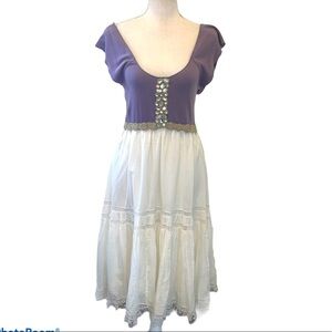 Pretty Free People tie back dress has a deep scoop neck and flutter cap sleeves. Airy, white lace trimmed boho skirt and a beautiful heathers purple bodice with contrasting crochet and jeweled details. Crystal embellishments. Tie waist. Lace underskirt. This is such a unique piece.