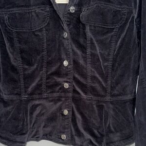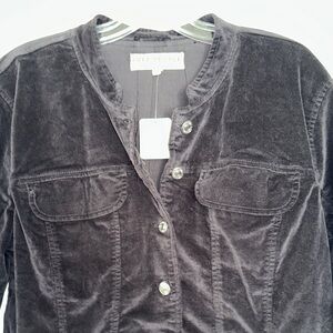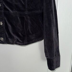 Features: Soft velvet fabrication, button closures, long-sleeves with cuffs, peplum-inspired hem, pocket detail at the chest