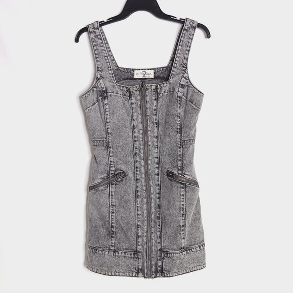 Elevate your wardrobe with this stunning Free People Johnny Black Denim Mini Dress. This form-fitting dress is made with a cotton blend fabric featuring an acid wash pattern, which adds a unique touch to your look. The dress has a square neckline with wide strap sleeves and a zip closure in the front that accentuates your figure.