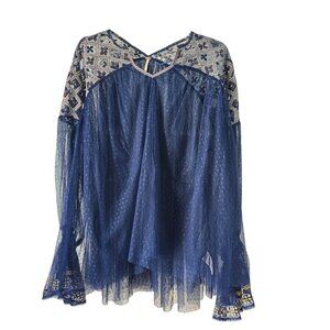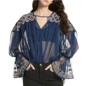 Free People Joyride Sheer Navy Bohemian Tulle Embroidered Top Size S