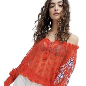 Free People Jubilee Red Embroidered Floral Mesh Oversized Top Womens Size XS