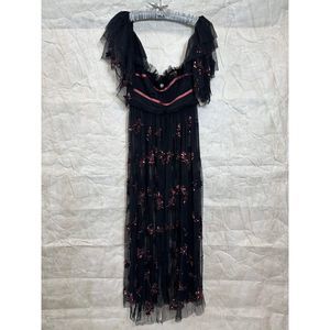 bust with contrast trim, square-neckline, short flutter sleeves, sequin embellishments throughout, slit at front, raw hemline, low open-back