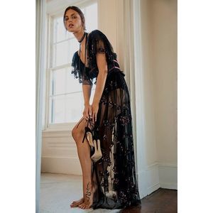 Features: Sheer fabrication, flattering ruched detailing at bust with contrast trim, square-neckline, short flutter sleeves, sequin embellishments throughout, slit at front, raw hemline, low open-back