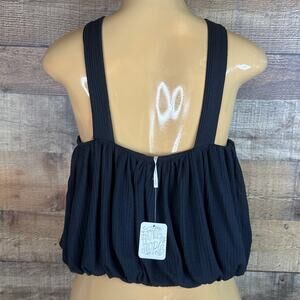 Free People Just A Fling Halter Tank Top. Style# OB966877. Size small. Color ~ Black. Super soft ribbed tank. Bubble hem silhouette. V-neck straps. Cropped style. Elastic hem top and bottom. Can be worn backwards as well for a different look. New with tags. Measurements are in the pictures.