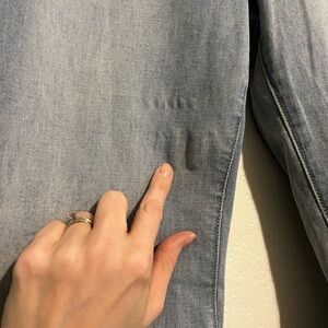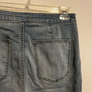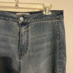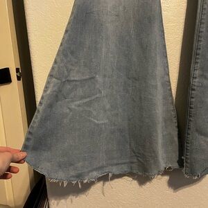 Description: High waisted, stretch, flare jeans, longer length, raw chewed hem