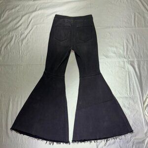 Gorgeous pre-loved Free People Just Float On super flare jeans in a versatile washed black with frayed hems. Worn only once – still in excellent condition! These jeans are ultra comfortable with a flattering high-rise fit and dramatic flare leg that gives serious vintage vibes.