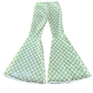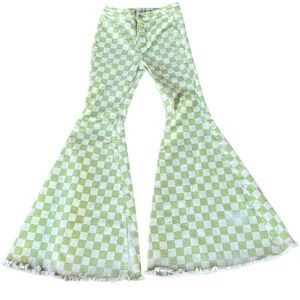 Free People Just Float On Flares Neon Green Check Super Flare Bellbottom Jeans. Women’s size 25. All-over Neon Green Checkerboard print. High waist, super flare leg opening, frayed hemline, back pockets. Stretch for comfort. So cute! Boho, hippie, festival vibes! This is a hard-to-find pattern!