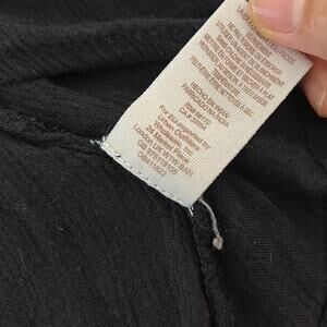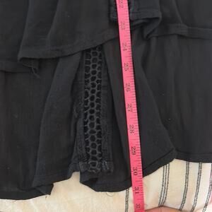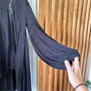 Channel your inner romantic in this boho-femme blouse from cooler-than-cool alternative American label Free People. Billowing solid black fabric in a loose and flowing construction cut extra-long with see through crochet insets throughout. Features a deep v-neckline with covered button. Finished with long balloon sleeves.