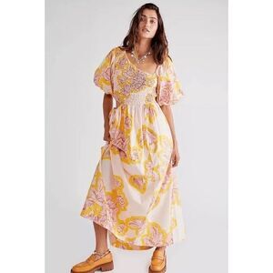 Free People Kalimantan Printed Midi Dress Bold Floral Ruched Blush Yellow Medium