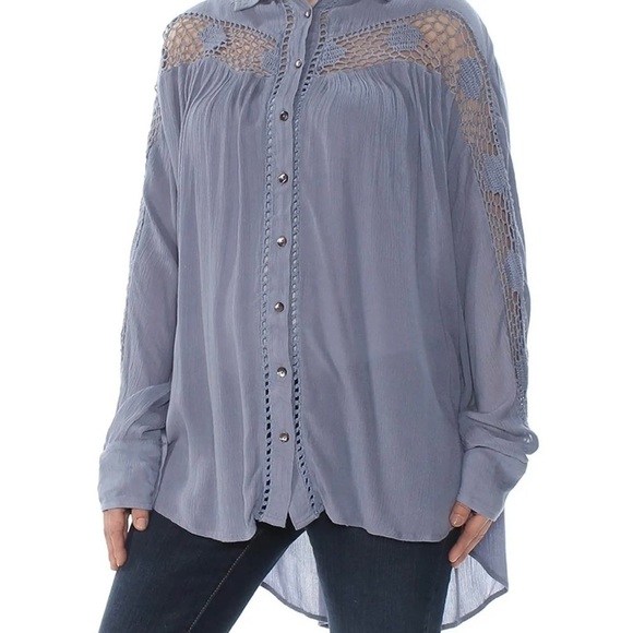 Free People Lace Crochet Inset Long Sleeve Blouse. Full button front. Slightly Longer in back. Lightweight Fabric. Cornflower Blue. VGUC 🚭