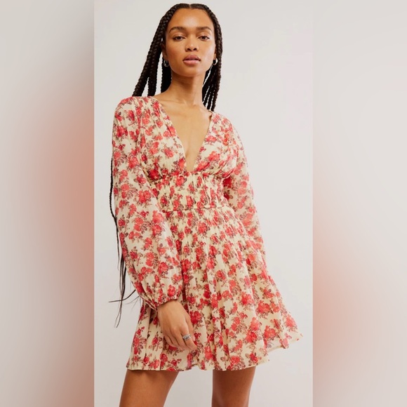This mini dress is the perfect combo of flirty and classy. With a flared skirt, a deep v-neck, puffy long sleeves, and a dainty floral pattern, this dress will have you feeling cute and fun!