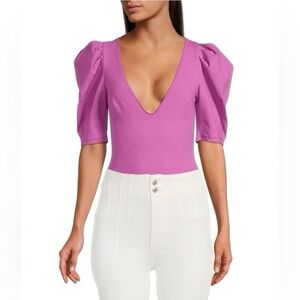 Free People Knit Deep V-Neck Short Ruched Puffed Sleeve Bodysuit Small