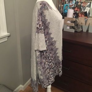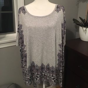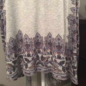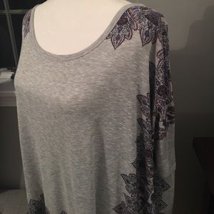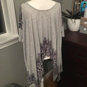 Size Small. Body is Heather grey, print is blues, berry, purple colors- close ups of tags also show color well. Longer on sides, low back neck drop. Last photo on form is the back. Very dramatic & cool! 😎