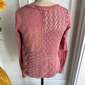Free People Knit Top with Open Patchwork Back. Size XS. It has raw edge seams and is a faded slub yarn knit. It has a scoop necklace line with a small slit placket.