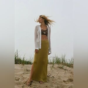 Free People Knitted Golden Hour Maxi Side Slit Skirt Olive Green Size L NEW