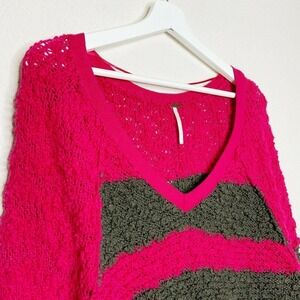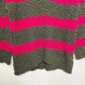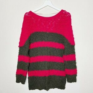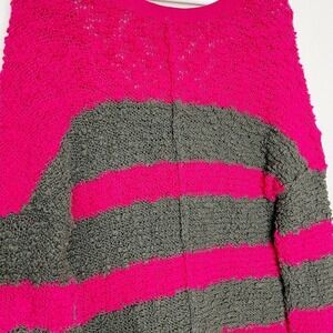 Super cool sweater by Free People. Block stripes in shades of fuchsia and a browinsh gray. Exposed seams at back and sleeves. Knubby knit and oh so cozy. Hem is slightly high low. Perfect go to! All measurements are approximate and taken flat.