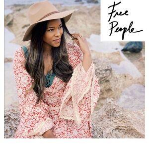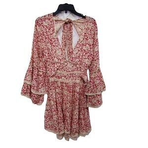 🌺Free People Kristall Berry Red Floral Print Bell Sleeve Mini Dress Medium🌸