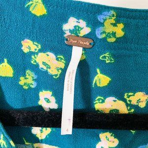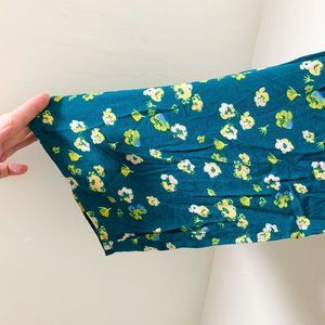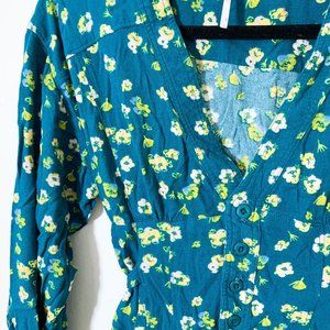 Features: Bold floral printed romper featuring pleat detailing and and adjustable waist tie, hip pockets, button front placket, long sleeves, floral.