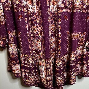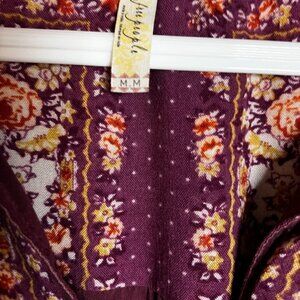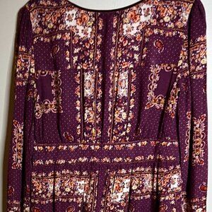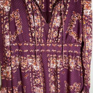 Free People LS Floral Dress Curved Hem V Neck Lace Up Size M