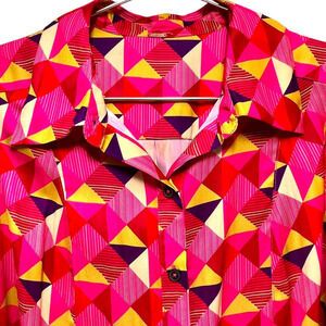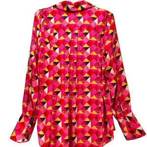 Style Tags: Business Casual, Office, Floral, Blouse, Patterned, Pink, Geometric, Businesswear, Top, Colorful, Artistic, Bold, Bright, 80s, 90s, Y2K, Retro-inspired