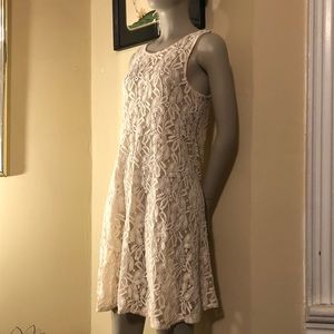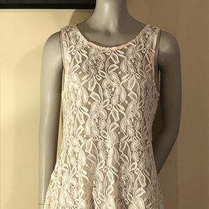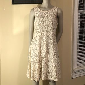 Cream/white colored Free People lace dress, size medium. This dress is a perfect example of why we love Free People. It’s simple, yet classy and elegant. It’s made well, beautifully detailed. Definitely needs a slip underneath. Nice soft material. Also has little snaps to hold your bra straps in. Gorgeous dress, pictures don’t do it justice! Excellent condition! No flaws.