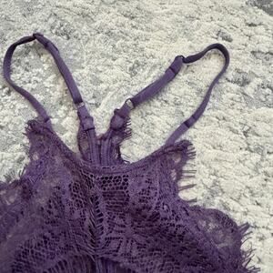 In great condition. Only worn once to a wedding. Beautiful shade of purple with exquisite detail. Features adjustable straps straps, buttons down the back, and lining (covers the front from the chest down and the end of the buttons down - the entire back down to the last button is just sheer lace). See pictures for approximate sizing and details.