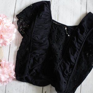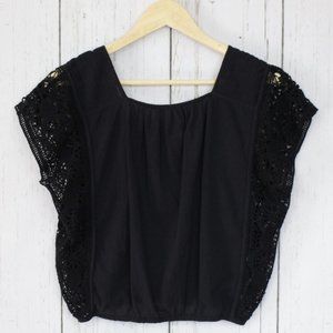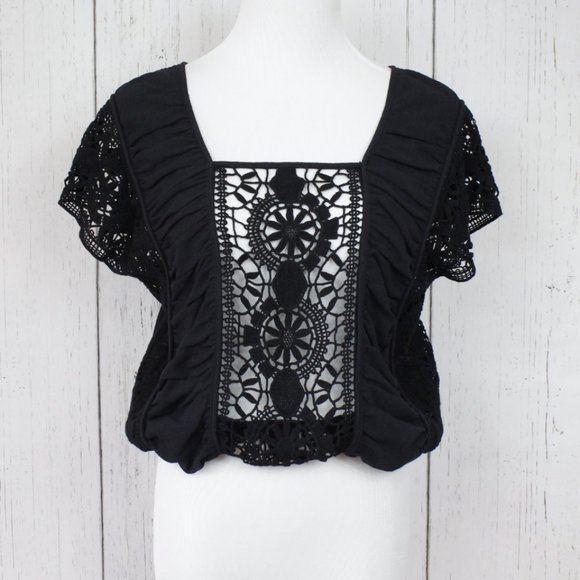 Square neckline. Open knit lacework down front and sides. Short lace sleeves. Elastic waist. Cropped length. Black. Size XS.