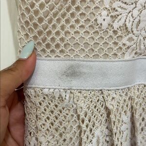Chic Free People new with tags lace midi dress in cream. Features a flattering V-neck and delicate lace overlay. They are brand new with the plastic tags but the actual tag was taken off. Never worn size 10 has a small dust stain but easily can be washed off and removed