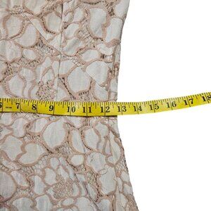 This delicate lace mini dress features an intricate floral pattern with a soft beige tone. It is designed with a flattering V-neckline and cap sleeves. FLAWED - there is a stain on the INSIDE lining - not visible from outside. Shown in pix