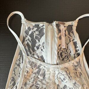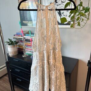 Brand new (without tags); never worn. Perfect summer dress! Gorgeous white/ivory lace with a light blue under layer / lining. Gorgeous sheer back!
