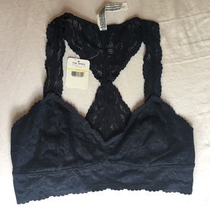 Brand new, with tags. Navy blue floral lace bralette from free people features mesh lining, scalloped edges and an angled racerback design. No cups. 90% nylon, 10% spandex/elastane. Size medium. Smoke free home.