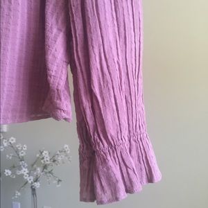 One of my favorites! It's a dull pinkish purple floral lace top with buttons down the front and elastic at the end of sleeves.