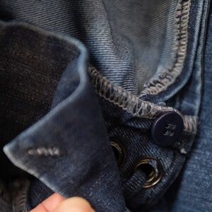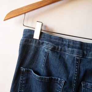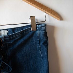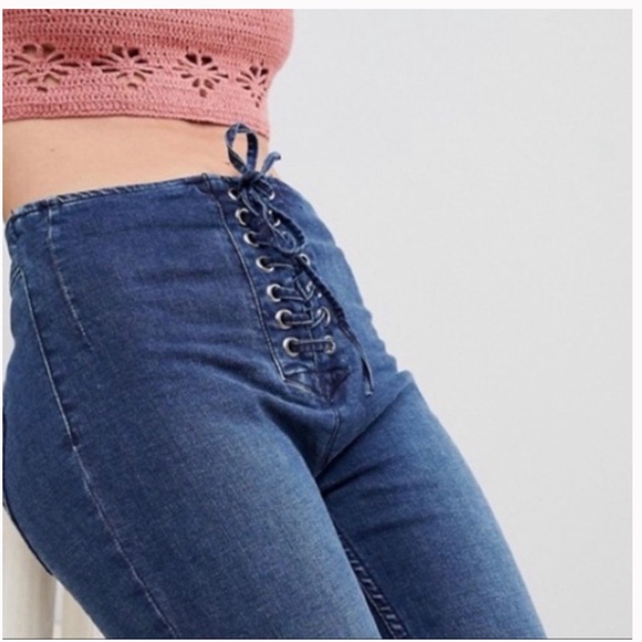 Lace up, tie front jeans from Free People. Dark wash. Interior button closure. High waist. Stretchy. In excellent condition. No flaws, pilling or stains.