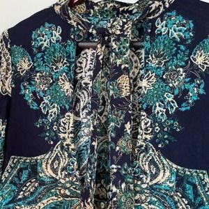 Keywords: Free People, Tunic Top, Floral Print, Paisley, Mock Neck, Long Sleeve, Bell Sleeve, Bohemian, Boho, Navy Blue, Green, Open Back, Tie Back, Casual, Dressy
