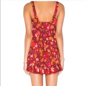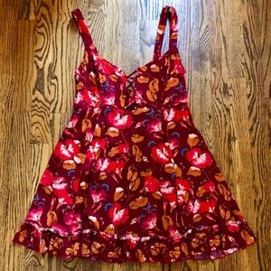 Floral print Free People slip dress with a criss-cross/lattice detail at the top and a ruffle hem. Would be super cute as a swim cover-up! New without tags - ended up being too short for me!