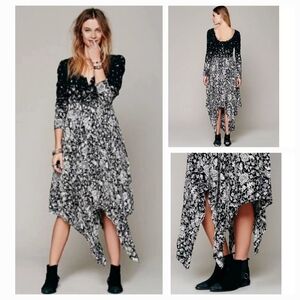 Elegant black and white floral dress with a unique asymmetrical hem. Perfect for any occasion.