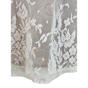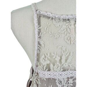 This sleeveless top features a delicate lace overlay with a sheer floral design and adjustable tie sides. Its loose fit and lightweight fabric provide elegance and comfort.