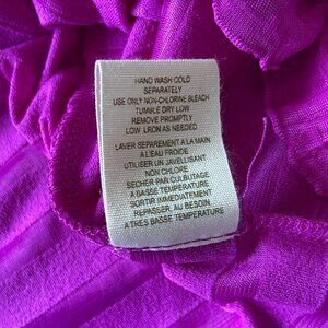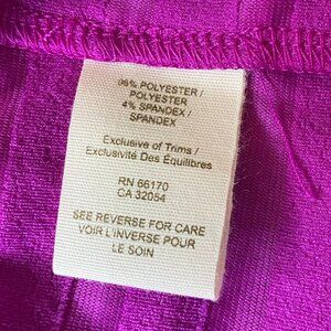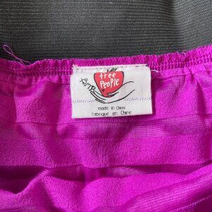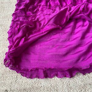 Cute mini skirt with tiered ruffles in a bright purple / pink (color is "hot berry"). Includes black elastic waistband. Skirt is stretchy and slightly sheer.