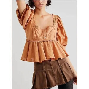 Brand new without tags! Extra button is still attached. This top by Free People features exaggerated sleeves, pleating at bottom for added shape and dimension, boxy and slightly cropped fit, square neckline, button-front detailing, and babydoll inspired silhouette. Gorgeous light brown, tan, neutral color.