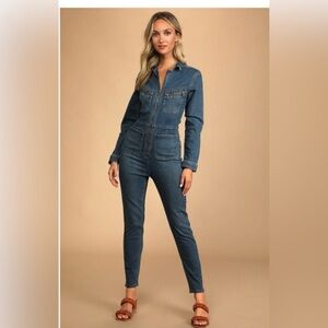 The Free People Lennox Medium Wash Denim Skinny Utility Jumpsuit took the utilitarian trend and gave it a new flattering fit! Stretchy denim (in Free People's Rider Blue wash) shapes a collared neckline, long sleeves with snap button cuffs, a zipping front, and four handy front pockets. Skinny pant legs begin at a fitted waist and boast back patch pockets before ending at ankle-length hems.