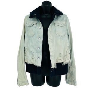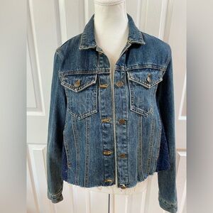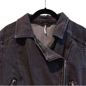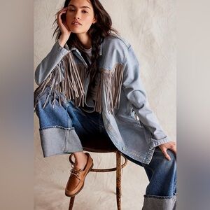 Free People Leopard Print Denim Jacket Raw Hem Button Up Trucker Style Women L