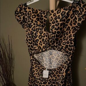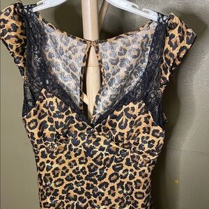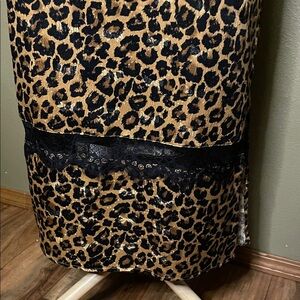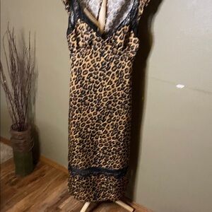 Leopard print slip dress with lace trim. Cap sleeves. V-neckline. Elegant and stylish.