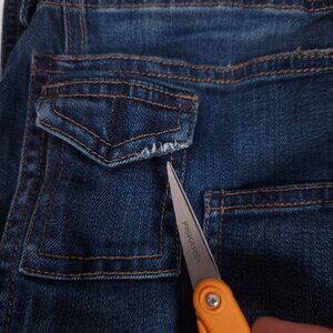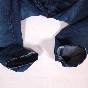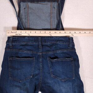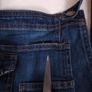Good Pre-Owned Condition with distressing: Fraying on edges including hems, pockets, bib portion, missing stitches front.