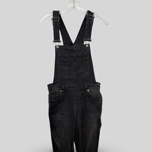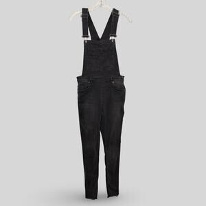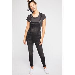 Free People lexden overalls in a washed black color. They have a skinny leg and frayed hem. They do stretch.