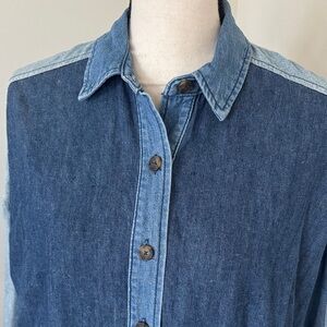 Stylish denim shirt with frayed edges. Features a classic collar and button details.