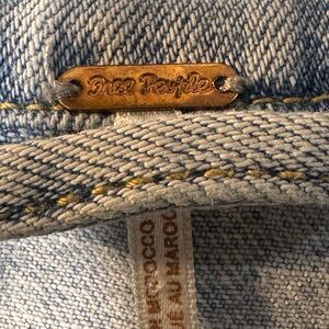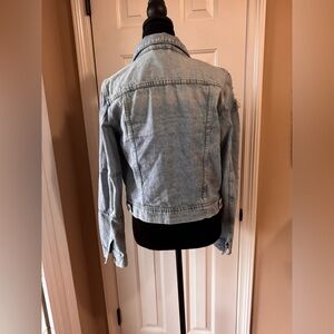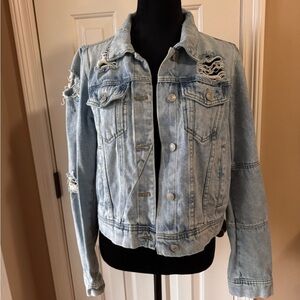 Stylish light blue denim jacket with distressed details by Free People. Features 4 useable front pockets. Perfect for casual wear.