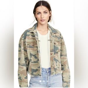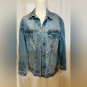 Stylish light blue denim jacket. Distressed details. Button-up front. Casual and trendy.