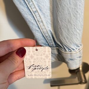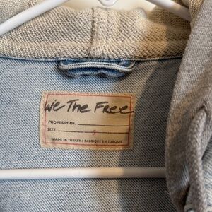 Stylish jean jacket with a cozy gray hood. Features classic button-up front and chest pockets. Perfect for layering.